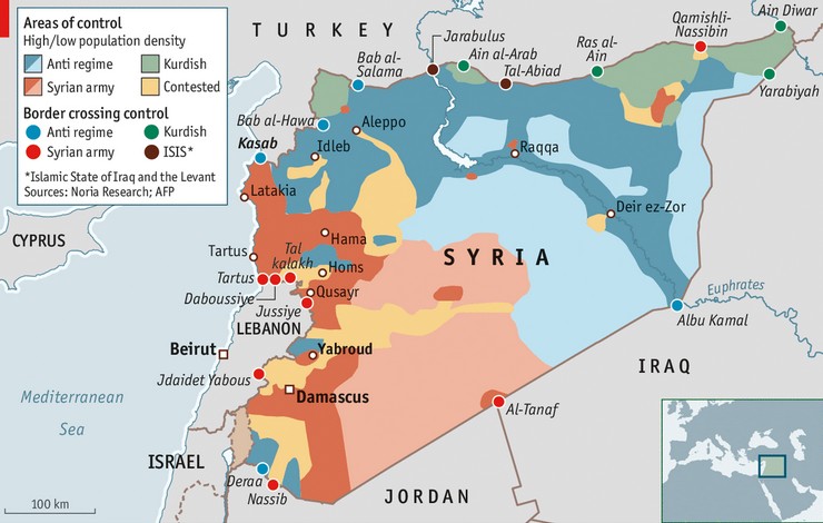 英国经济学人网站3月25日发表了题为《进展情况》的文章。文章称,叙利亚政府军与反对派的争斗依旧在继续,而《经济学人》所提供的一张地图则是显示出了叙利亚战争哪一方控制了哪一处叙利亚境内领土以及边境口岸的最新情况。