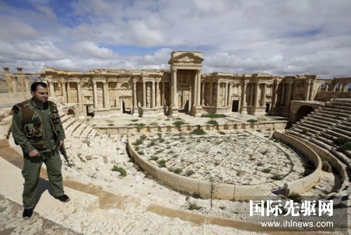 3月14日,一名警察在距离叙利亚首都大马士革东北部215公里处的巴尔米拉古城遗址巡逻。新华/法新