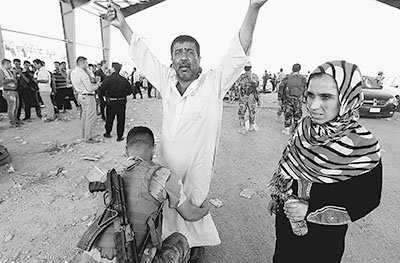 6月10日,在伊拉克库尔德自治区的艾斯基凯莱克检查站,一名安全人员对一名逃离尼尼微省的男子搜身。新华社发