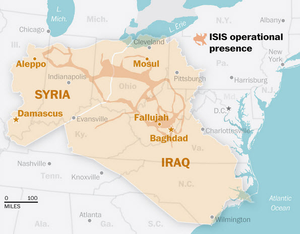 《华盛顿邮报》还以美国读者的视角制作了下图,我们可以看到,ISIL的控制范围相当于美国中部的伊利诺州到东海岸的弗吉尼亚州。