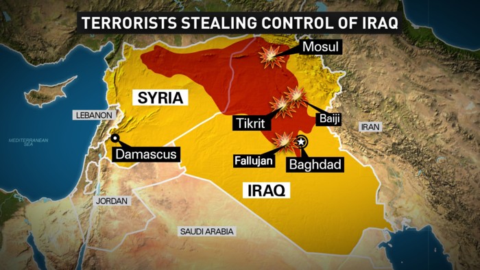 这是ISIS武装截至本月12日控制的伊拉克及叙利亚领土(红色区域)。