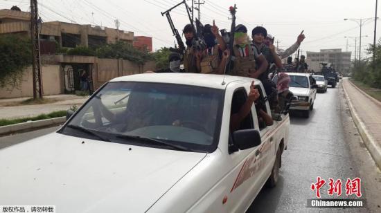 当地时间2014年6月12日,伊拉克摩苏尔,伊拉克宗教极端组织“伊拉克和黎凡特伊斯兰国”从伊拉克政府军处抢夺车辆,开车游行。