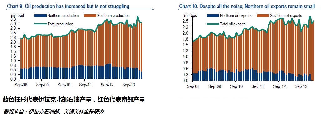 伊拉克的大部分油田位于什叶派占多数的南部地区,那里远离最近暴乱升级的地区。而且,伊拉克十年来大部分新增石油产量都归功于南部,2003年全国日产量130万桶,2013年320万桶。