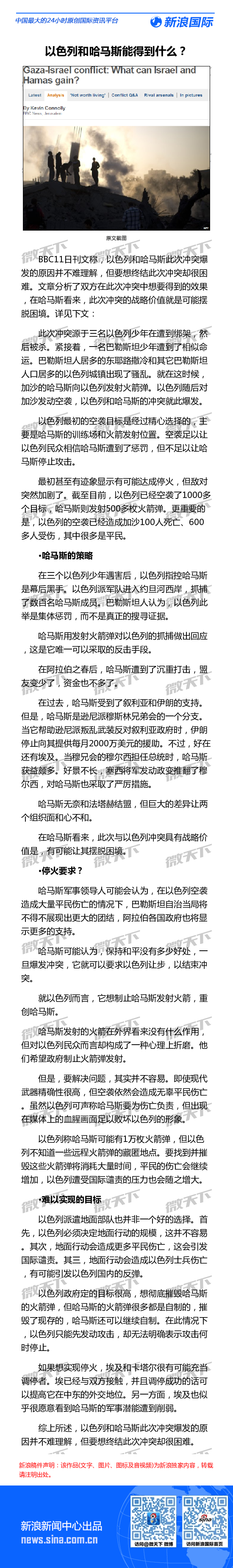 新浪网:以色列和哈马斯分别能在冲突中得到什么?