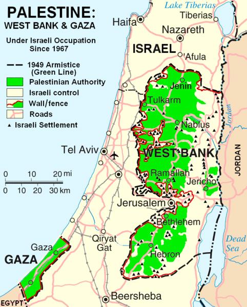 1967年第三中东战争后,以色列占领了巴勒斯坦全境,其后经过多次艰难的谈判,巴勒斯坦人最终在约旦河西岸、加沙地带这两个区域获得有限的自治。