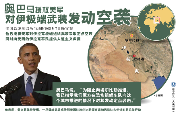 最近几天,极端武装组织继续在伊拉克境内推进,并逼近伊北部城市、库尔德自治区首府埃尔比勒。由于美国在这个城市设有领事馆,同时派驻有美军顾问人员,美方利益顿时受到巨大威胁。此外,当地的冲突导致数十万人流离失所,一些教派民众不得不逃到山上避难,一场人道主义危机迫在眉睫。