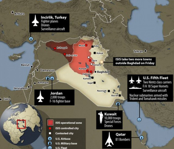 伊拉克政府在暴恐组织ISIS于6月10占领伊拉克重要城市摩苏尔和提克里特后,在6月18日就向美国发出了空袭极端组织的请求。6月19日,奥巴马就指出,极端组织“伊拉克和黎凡特伊斯兰国”在伊拉克发起的攻势对伊拉克、中东地区和美国利益构成“威胁”,阻止伊拉克爆发全面内战符合美国国家安全利益,为此美国政府采取一系列应对举措。宣布采取一系列举措帮助伊拉克政府打击反政府武装,包括向伊拉克增派300名军事顾问、与伊拉克成立联合行动中心、视情况对“伊拉克和黎凡特伊斯兰国”采取“定点和精确的军事行动”等。美军不会重返伊拉克参加作战任务,伊拉克当前危机不能通过军事途径加以解决。他强调,他将与美国国会以及伊拉克和该地区其他国家领导人保持“密切”磋商,而应对“伊拉克和黎凡特伊斯兰国”之类威胁的“最佳和最有效”途径是以伊拉克等地区力量为主导建立伙伴关系。