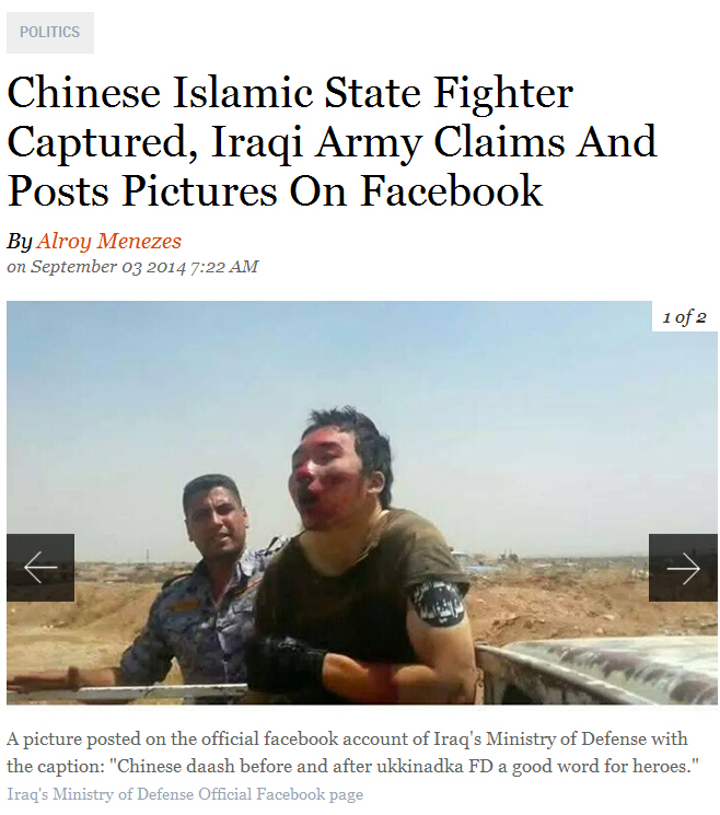 大公网记者从美国国际商业时报网站(IBTimes)了解到,伊拉克国防部最近在Facebook发放两张照片,显示一名被伊军擒获的ISIS圣战分子,并指他是中国人。