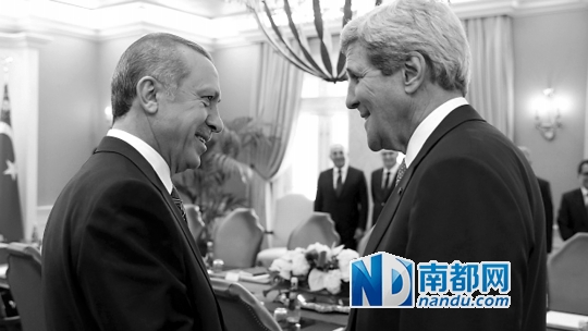 土耳其总统埃尔多安和美国国务卿克里在安卡拉会谈,美国正向土耳其施压,要求其收紧对边境的控制。