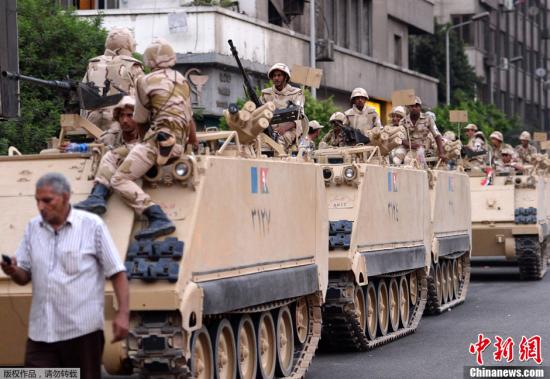 据央视报道,在埃及军方为支持和反对现任总统穆尔西的两大阵营设置的48小时解决危机最后期限到期后的数小时,埃及军方与反对派举行了会晤。北京时间4号凌晨三点,埃及军方发表声明表示,总统穆尔西已经下台。图为当地时间7月3日,埃及开罗,军队在穆尔西支持者聚集地附近的街头部署装甲车。