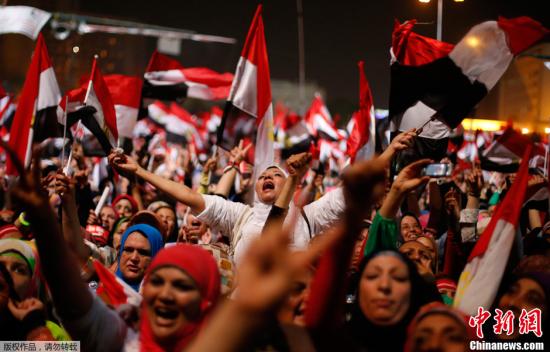 据央视报道,在埃及军方为支持和反对现任总统穆尔西的两大阵营设置的48小时解决危机最后期限到期后的数小时,埃及军方与反对派举行了会晤。北京时间4号凌晨三点,埃及军方发表声明表示,总统穆尔西已经下台。图为要求穆尔西下台的民众聚集在开罗解放广场,他们高呼口号挥舞旗帜要求穆尔西辞职。