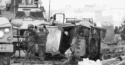 阿富汗警察和北约士兵检查自杀性汽车炸弹袭击事故现场。