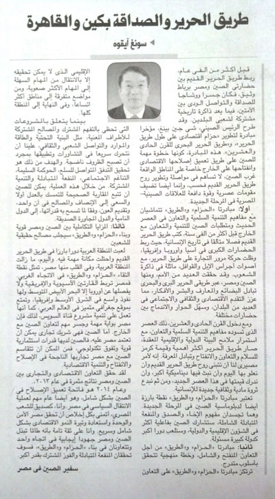 2014年5月6日,驻埃及大使宋爱国在埃及第一大报《金字塔报》发表题为《丝绸之路与中埃友谊》的署名文章。文章重点介绍了中国国家主席习近平提出的共建“丝绸之路经济带”和“21世纪海上丝绸之路”的倡议,深入阐述了“一带一路”战略构想的历史意义和时代内涵,扼要回顾了近年来中埃经贸合作取得的可喜成果,并积极展望两国在“一带一路”框架下推进互利合作的广阔前景。文章译文如下:
