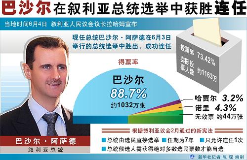 当地时间6月4日晚间,叙利亚官方公布了总统选举结果,现任总统巴沙尔毫无悬念地高票胜出,成功连任。中国中东问题特使在接受记者专访时说,叙利亚各方当务之急是尽快停火止暴,重启政治对话。