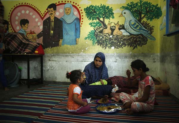 一名巴勒斯坦妇女带着女儿们暂住在加沙的一所联合国避难学校里。