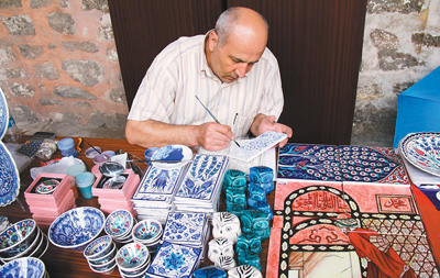 土耳其托普卡帕皇宫门前,当地手工艺人临摹的中国青花瓷器深受游客欢迎。(本报记者 刘睿摄)