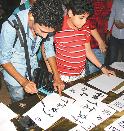 埃及孔子学院内,当地青少年正在尝试用毛笔书写汉字。(本报记者 刘睿摄)