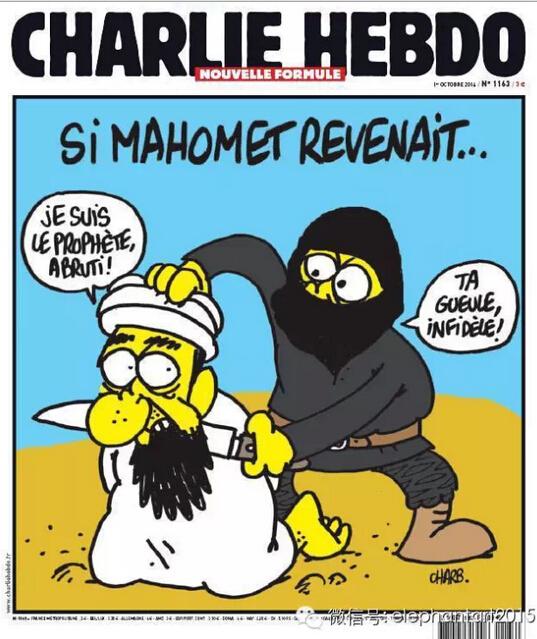 这幅题目名为《如果默罕默德回来》的《查理周刊》封面,先知跪在地上被自己的信徒拿刀威逼着,先知说道:“傻瓜,我是先知!”恐怖分子答道:“闭嘴,你这个靠不住的!”(资料图)