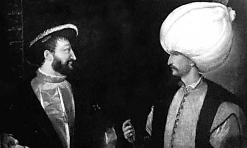 图片说明: 油画大师提香于1530年创作的《弗朗索瓦一世与苏莱曼大帝》,描绘了法国与奥斯曼土耳其帝国的蜜月期。