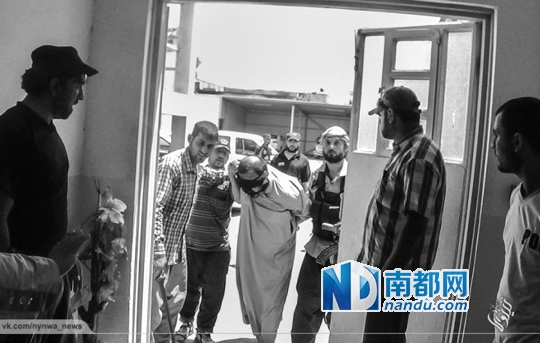 “伊斯兰国”组织占领摩苏尔后,设置了自己的警察机构,图为他们押解一名犯人来到他们设置的监狱,该组织经常杀戮被怀疑与伊拉克政府合作的人。