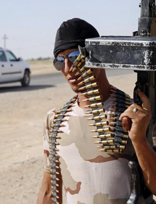 2014年9月9日,一名巴德尔旅的民兵在伊拉克北部Suleiman Beg的一处机动检查站执勤